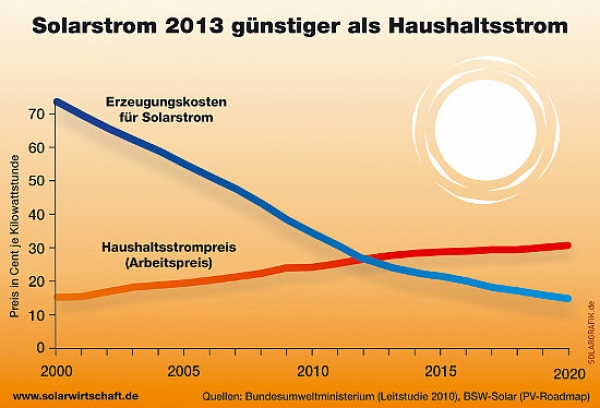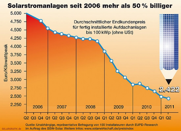 Le coût des installations solaires (toits résidentiels) en Allemagne a été divisé par deux en 5 ans, selon la Fédération solaire allemande BSW, qui estime que l’électricité solaire pourrait devenir moins chère que l’électricité fossile dès 2013.