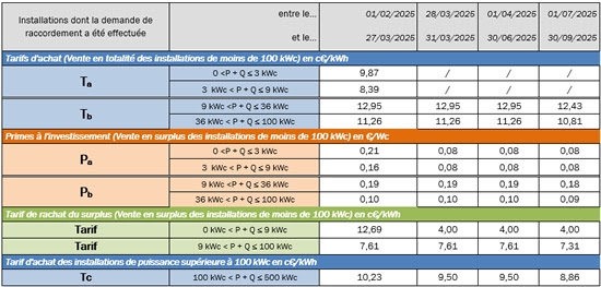 Tarifs de rachat du T3 2025