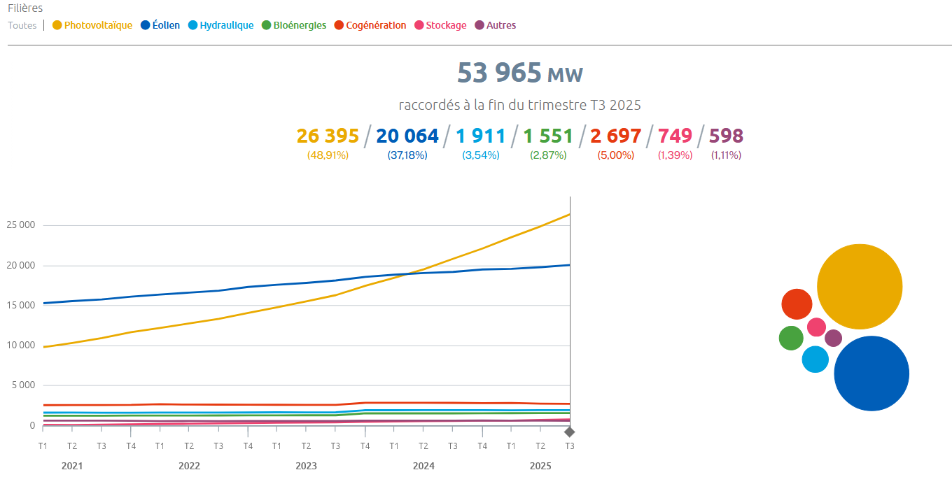 Au troisième trimestre, Enedis a raccordé à son réseau de distribution 1,5 GW de capacités photovoltaïques et 58 MW de stockage. Les deux filières confirment leur dynamique. Avec respectivement 4,3 GW et 142 MW supplémentaires depuis le début 2025, elles ont déjà – en trois trimestres – installé presque autant que sur l’année 2024 entière (4,7 GW et 146 MW).